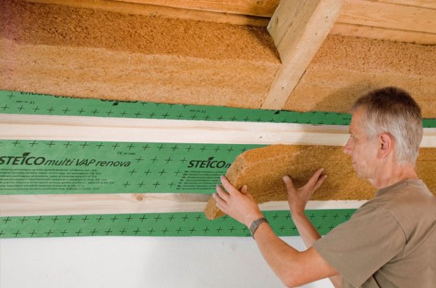 STEICOmultimembra 5 – to najbardziej popularna membrana paroizolacyjna stosowana w nowym budownictwie. Charakteryzuje się niezwykle dużą wytrzymałością mechaniczną oraz ma opór dyfuzyjny sd = 5m, czyli jest swoistym opóźniaczem przepływu pary wodnej. Nie zamyka całkowicie możliwości migracji wilgoci przez przegrodę, ale jedynie ją ogranicza – tak, aby para wodna zdążyła odparować na zewnątrz, zanim dojdzie do kondensacji. Jest też dodatkowo zbrojona włóknami polipropylenowymi, dzięki czemu może być stosowana zarówno z matami izolacyjnymi STEICOflex, jak również z izolacją do wdmuchiwania STEICOzell i STEICOfloc.