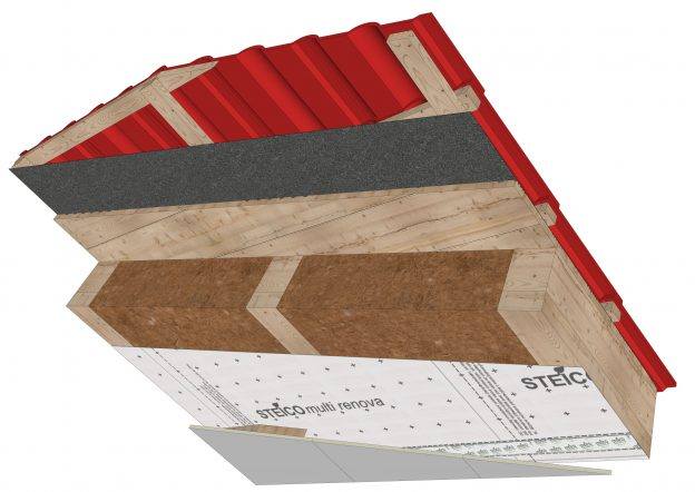 Dodatkowo po zewnętrznej stronie dachu lub ściany z elewacją wentylowaną używa się płyty STEICO universal, a w przypadku ściany z tynkiem płyty STEICO protect. Daje to dodatkową osłonę przed przenikaniem ciepła przez konstrukcje, czyli nie powstaje mostek termiczny.