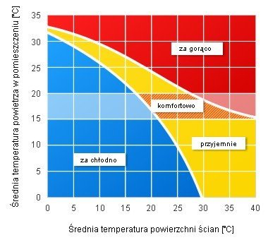 - Największy komfort cieplny uzyskamy w granicach 15-20°C (zakładając, że temperatura powierzchni ścian wewnątrz budynku kształtuje się w przedziale 17-27°C)