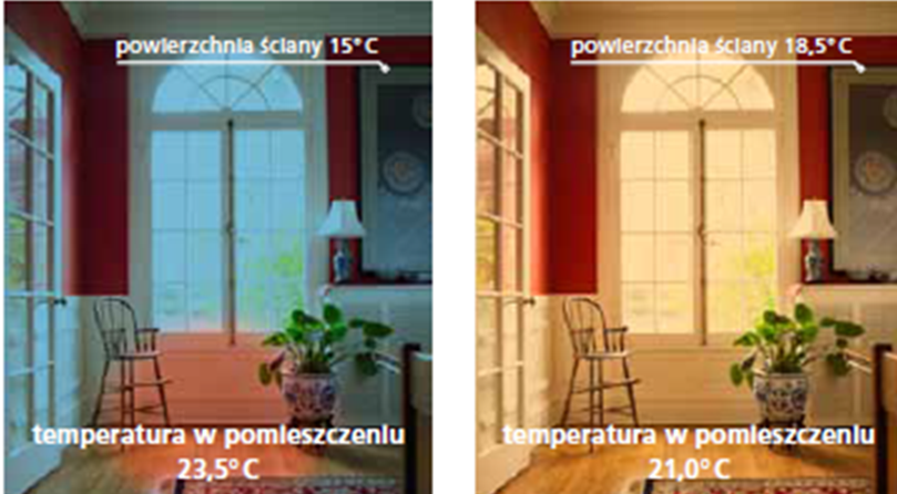 - Praktycznie najbardziej efektywne jest utrzymanie temperatury powierzchni ścian na poziomie ok. 20°C, wówczas temperatura powietrza może kształtować się w zakresie 17–20°C.