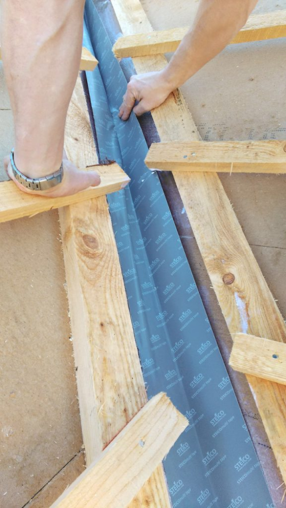 Dodatkowo występuje linia 3 cm od dłuższej krawędzi folii. Jest ona niezastąpiona podczas sklejania dwóch pasów ze sobą. Sklejanie wykonuje za pomocą taśmy STEICO multi tape F60lub STEICO multi tape P 60. Taśmy mają szerokość 6 cm – czyli po 3 cm na każdy pas paroizolacji.