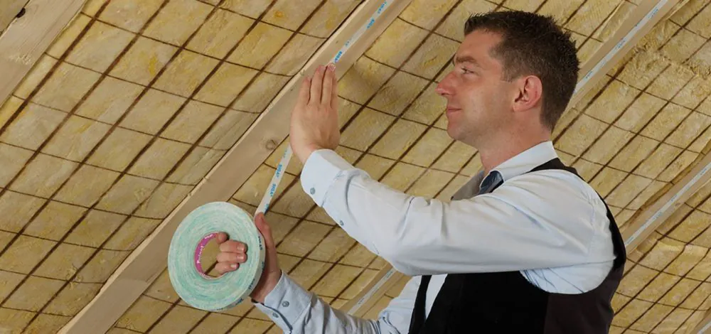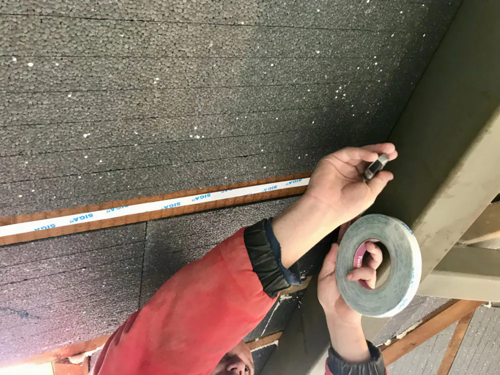 • jako taśma do szczelnego przyklejania membran paroizolacyjnych do drewna (słupki ścienne, krokwie, belki stropowe, płatwie itd.) oraz do metalu (metalowe profile w ściankach działowych)