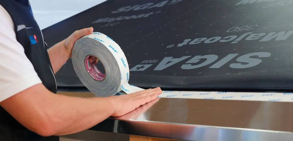 Dwustronna taśma do przyklejania membrany paroizolacyjnej i dachowej do twardych podłoży takich jak drewno i metal. Umożliwia szybki montaż membran bez konieczności stosowania zszywek. Jest bardzo odporna na odrywanie oraz deszcz. Szwajcarska jakość.