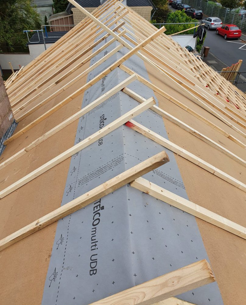 - membrana wiatroizolacyjna mocowana bezpośrednio do deskowania dachu (od zewnątrz) – zewnętrzna warstwa zapewniająca szczelność powietrzną
