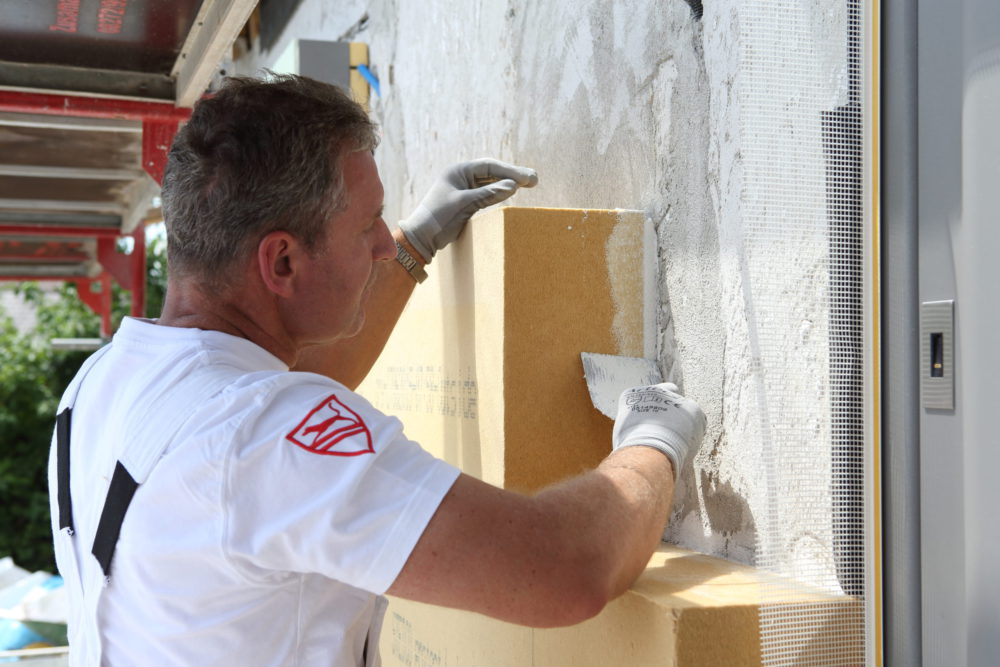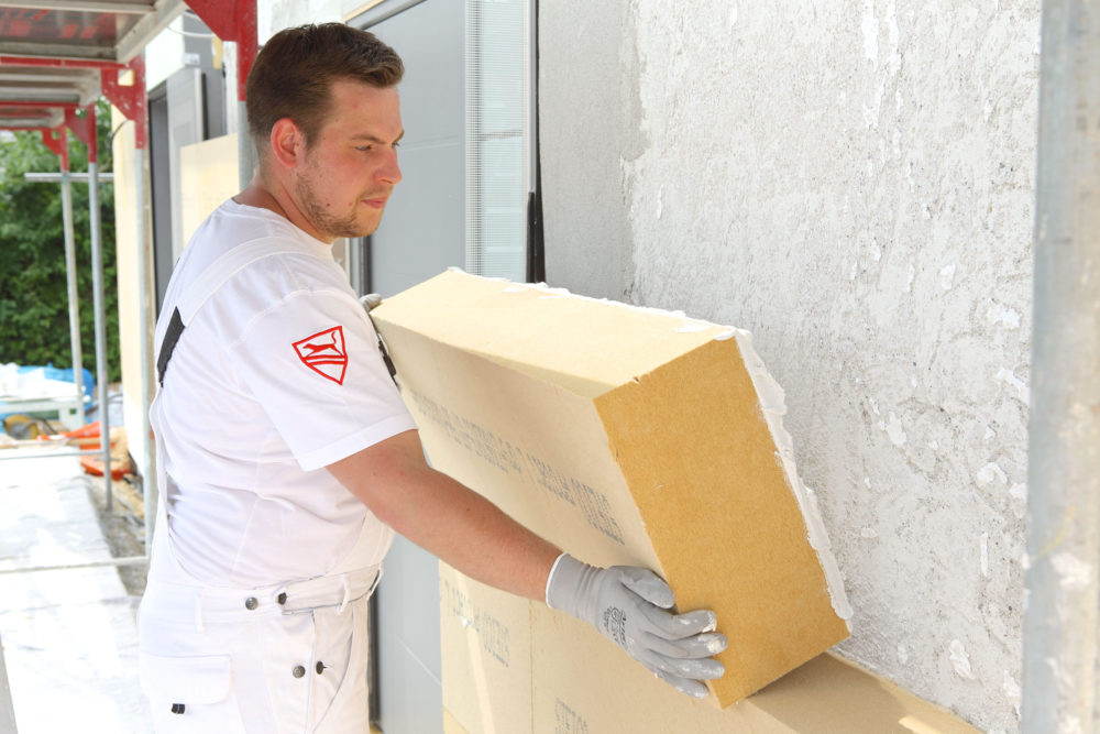 Przyklejanie płyt STEICOprotect L dry przy pomocy kleju quick-mix SKS. Źródło: STEICO