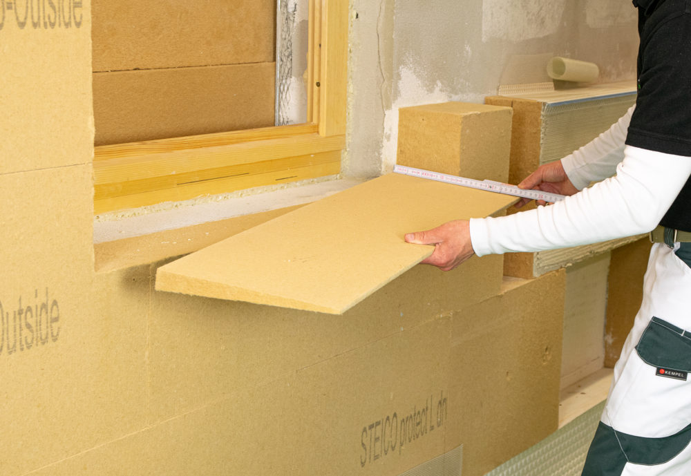 - Klin termoizolacyjny z włókien drzewnych w połączeniu z systemem tynkarskim jako druga warstwa odprowadzająca wodę w strefie parapetu zewnętrznego. Idealne rozwiązanie dla elewacji tynkowanych w domach murowanych.