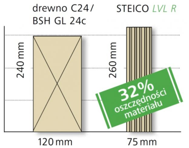 STEICO LVL wykorzystuje się wszędzie tam, gdzie lite drewno musiałoby mieć bardzo duże przekroje lub zależy nam na bardzo dużej wytrzymałości na zginanie lub ściskanie. W pewnych przypadkach taką belką konstrukcyjną mogą zastąpić nawet dwuteowniki stalowe typu HEA czy HEB